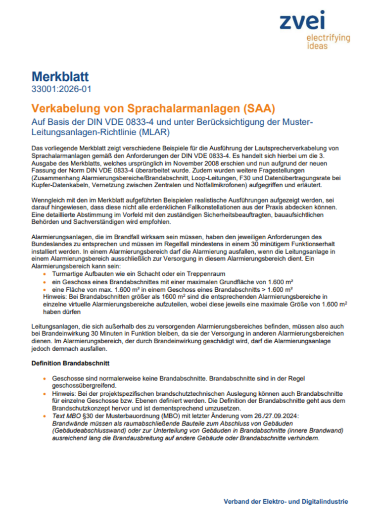 Dieses Merkblatt zeigt verschiedene Beispiele für die Ausführung der Lautsprecherverkabelung von Sprachalarmanlagen gemäß den Anforderungen der DIN VDE 0833-4) und unter Berücksichtigung der Muster-Leitungsanlagen-Richtlinie (MLAR).