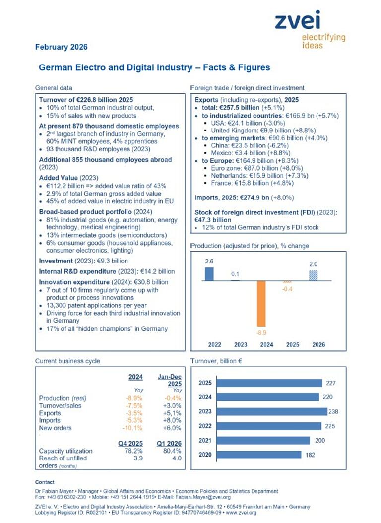 The fact sheet provides an up-to-date overview of the most important economic and structural data on the German Electro and Digital Industry.