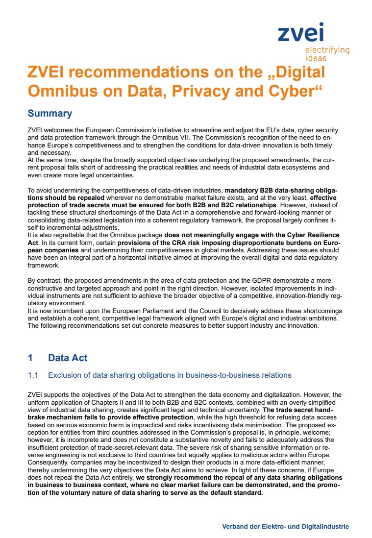 ZVEI recommendations on the „Digital Omnibus on Data, Privacy and Cyber“