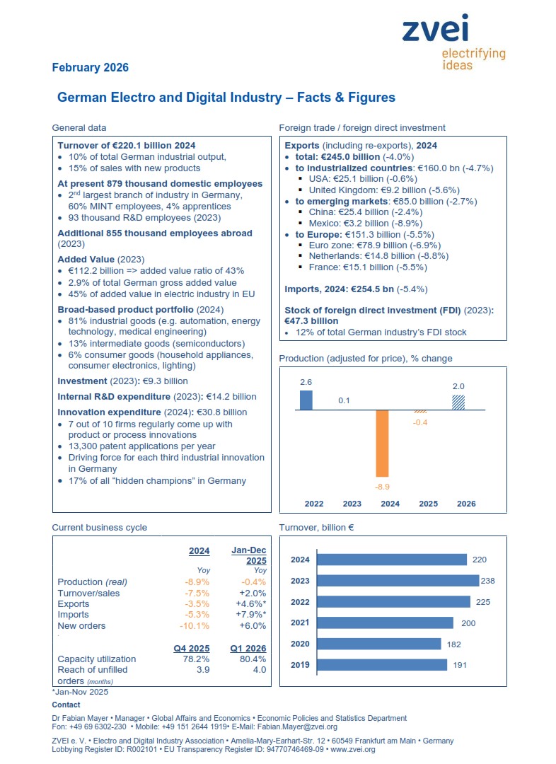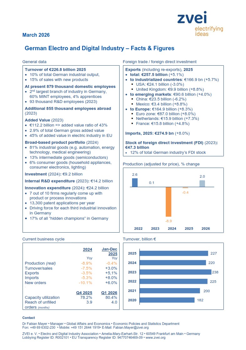 This fact sheet provides an up-to-date overview of the most important key figures for the German Electro and Digital Industry based on ZVEI's own surveys.