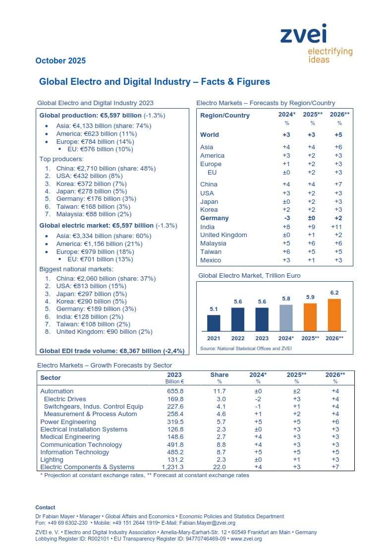 According to the latest calculations by the ZVEI, the global market for goods of the electro and digital industry reached a value of €5,765bn in 2024. For the current year, the global electro market…