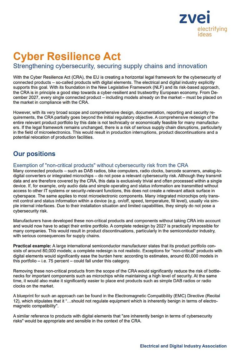 The Cyber Resilience Act (CRA) establishes a new European standard for the cybersecurity of connected products. While the ZVEI supports this goal, the current legal framework poses considerable challenges. From December 2027, all products, including existing models, must comply with the CRA. For many companies, this will require significant technical adjustments that will be difficult to implement in the short term.