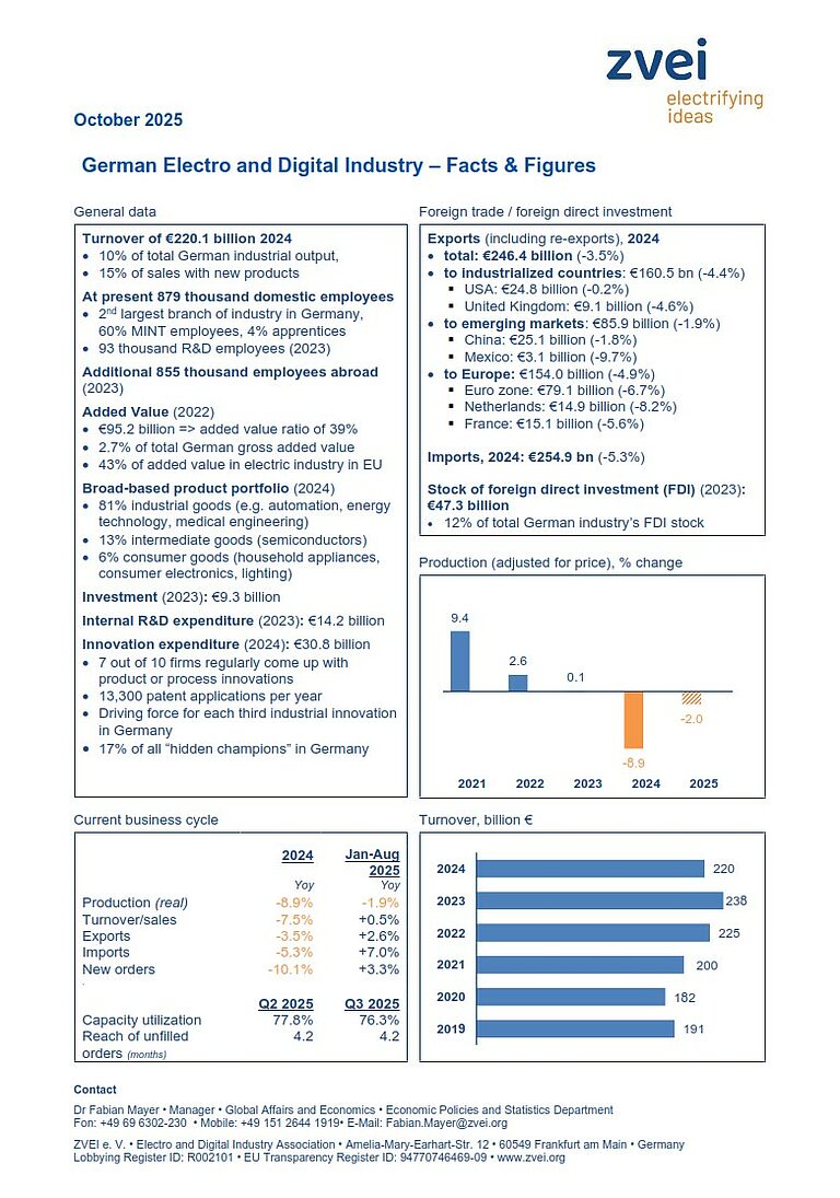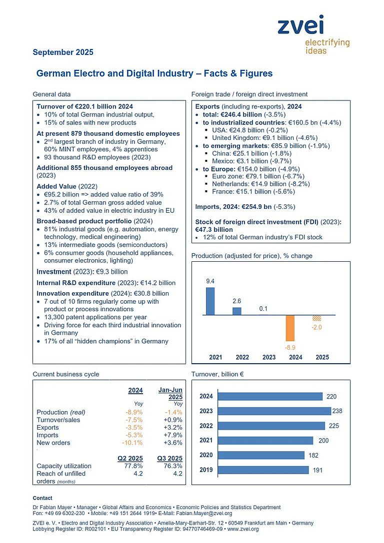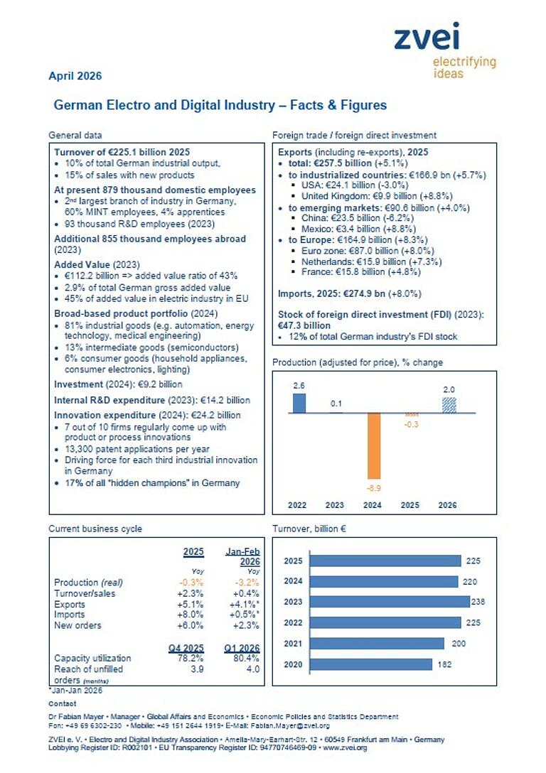 The fact sheet provides an up-to-date overview of the most important economic and structural data on the German Electro and Digital Industry.