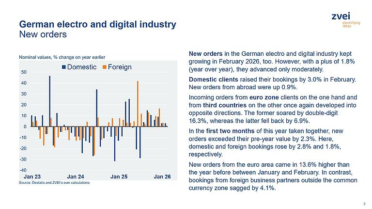 New orders in the German electro and digital industry continued to rise in February 2026. However, with an increase of just under two percent compared to the previous year, growth was only moderate this time around. Nominal revenue rose in February compared to the same month a year earlier, while production declined once again.
