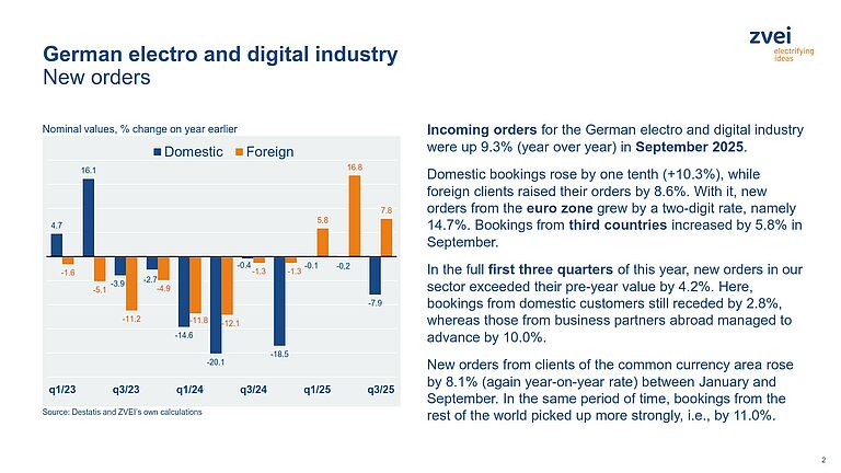 Incoming orders for the German electro and digital industry were up 9.3% (year over year) in September 2025. Domestic bookings rose by one tenth (+10.3%), while foreign clients raised their orders by 8.6%. With it, new orders from the euro zone grew by a two-digit rate, namely 14.7%. Bookings from third countries increased by 5.8% in September.
