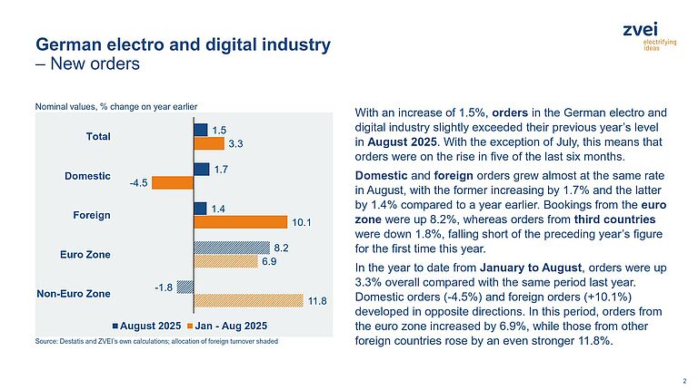 With an increase of one and a half percent, orders in the German electro and digital industry slightly exceeded the previous year’s level in August 2025. With the exception of July, this means that orders were on the rise in five of the last six months, with domestic and foreign orders growing at almost the same rate.