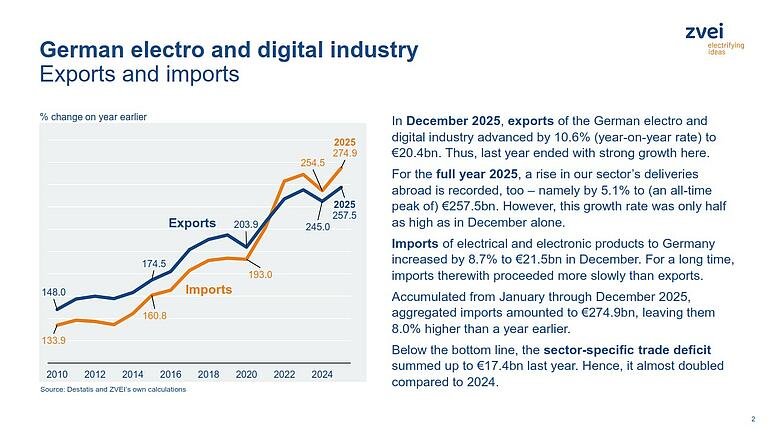 In December 2025, exports of the German electro and digital industry advanced by 10.6% (year-on-year rate) to €20.4bn. Thus, last year ended with strong growth here. For the full year 2025, a rise in our sector’s deliveries abroad is recorded, too – namely by 5.1% to (an all-time peak of) €257.5bn.