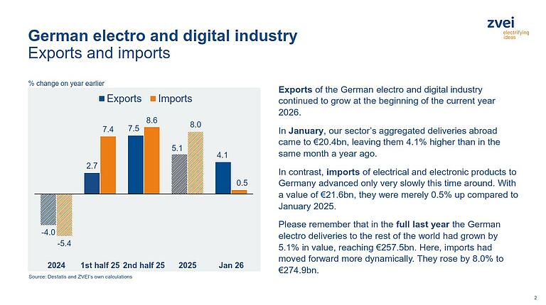 Exports of the German electro and digital industry continued to grow at the beginning of the current year 2026. In January, our sector’s aggregated deliveries abroad came to €20.4bn, leaving them 4.1% higher than in the same month a year ago.