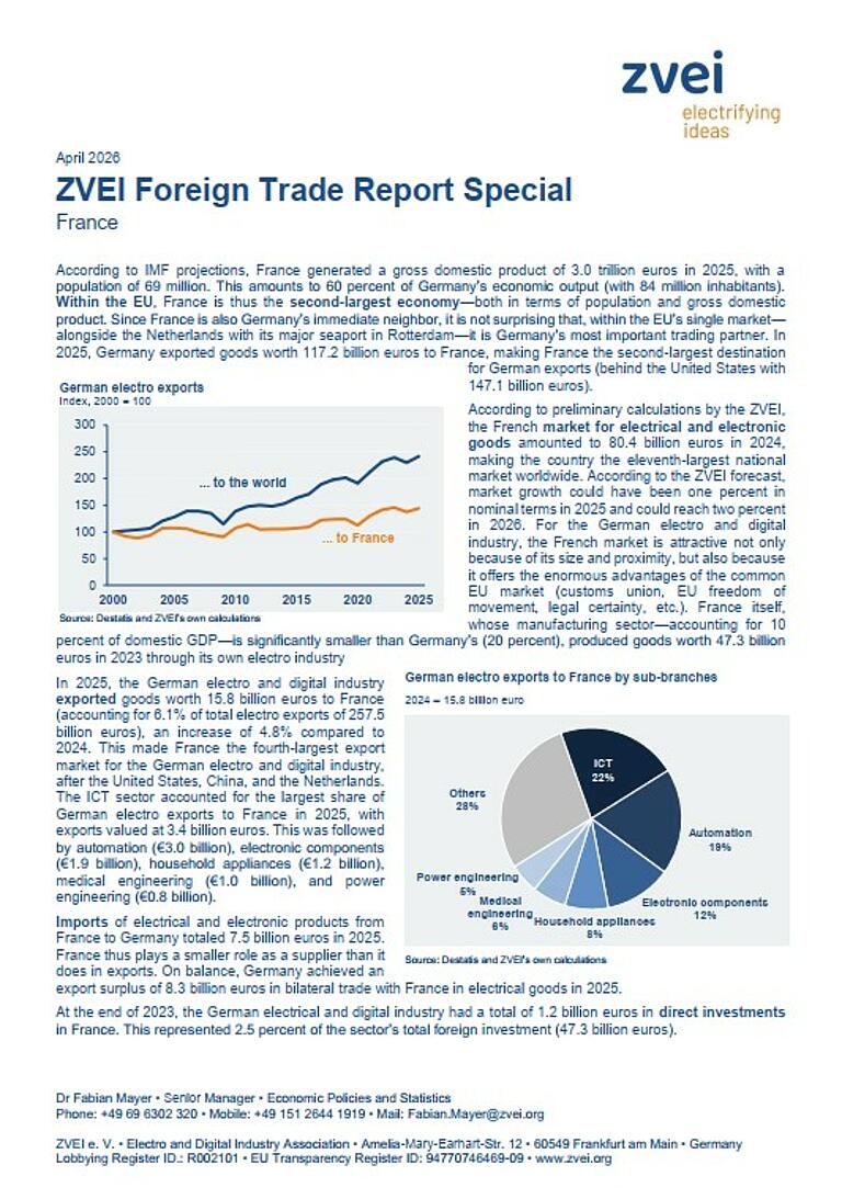 France is one of Germany’s most important economic partners and is also one of Europe’s largest markets. The neighboring country offers significant opportunities, particularly for the German electro and digital industry—driven by close trade ties and the advantages of the EU single market. This overview highlights France’s current economic significance as well as key developments in bilateral trade and the sectoral structure.