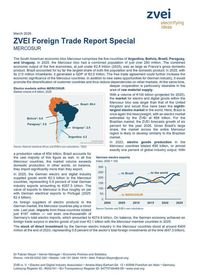 The Mercosur bloc (Argentina, Bolivia, Brazil, Paraguay, and Uruguay) is home to over 280 million people. The combined economic output of these five economies, at just under 2.8 trillion euros (2024), is nearly equal to France’s gross domestic product. Taken together, the Mercosur countries would constitute the eighth-largest electro goods market in the world. Given the economic significance of the Mercosur countries, German industry in particular, with its high-quality capital goods, hopes are that a free trade agreement between the EU and Mercosur will open up new sales opportunities.