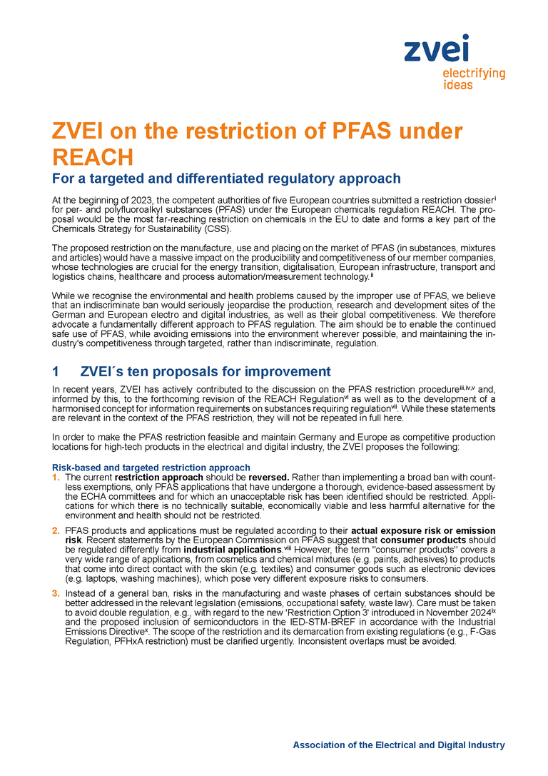 In ten key demands, the ZVEI sets out why only a nuanced, science-based and industry-proof regulatory approach can strengthen environmental and health protection without undermining Europe’s technological base. The detailed demands can be downloaded here.