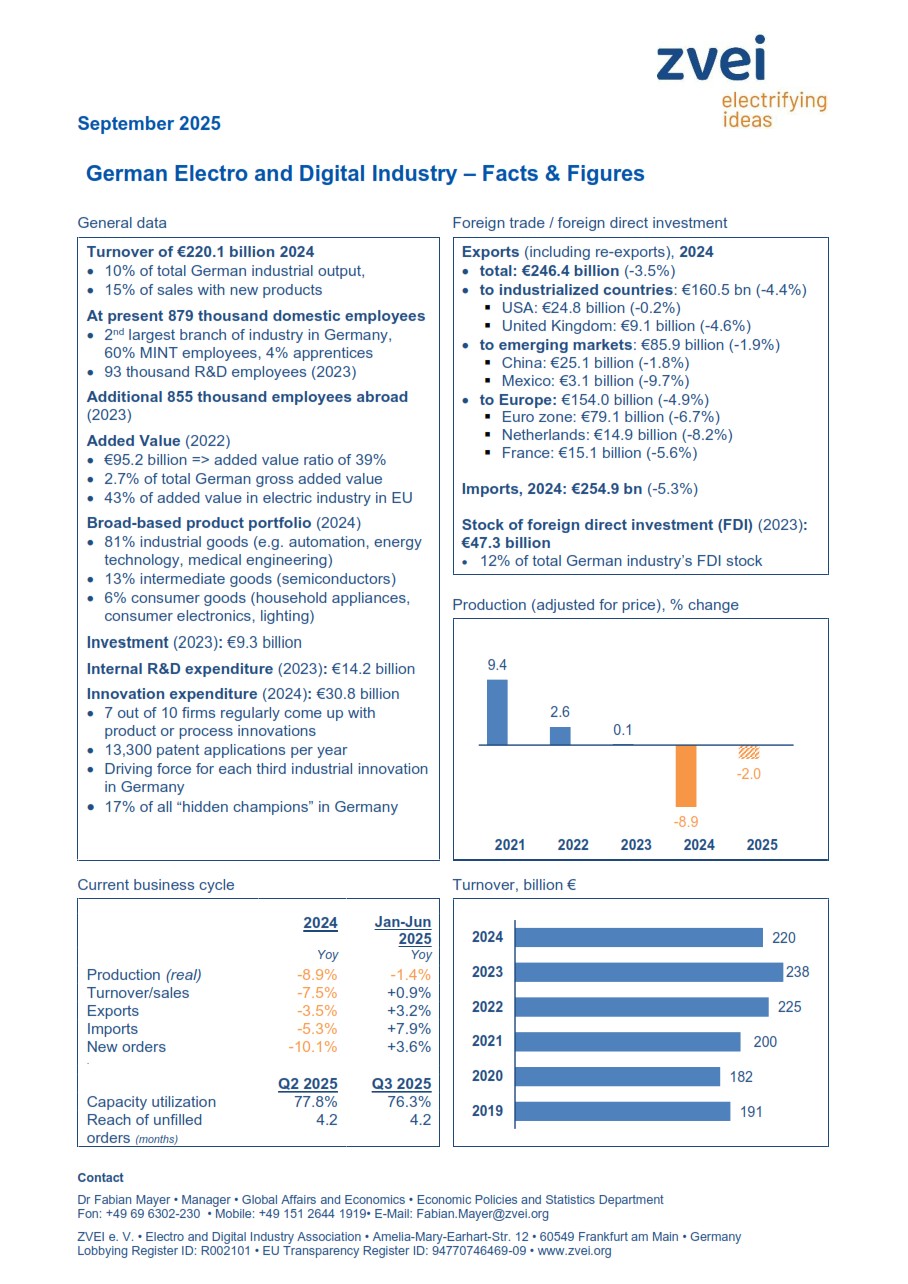 The fact sheet provides an up-to-date overview of the most important economic and structural data on the German Electro and Digital Industry.