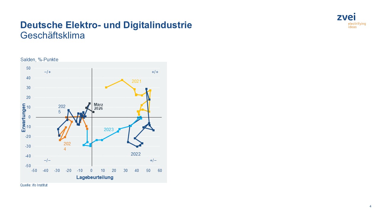 „Trotz des Iran-Kriegs ist das Geschäftsklima in der deutschen Elektro- und Digital-industrie im März leicht gestiegen. Das lag vor allem an einer besseren Beurteilung der aktuellen Lage als noch im Februar. Die allgemeinen Geschäftserwartungen fielen dagegen leicht zurück”, analysiert Gontermann.