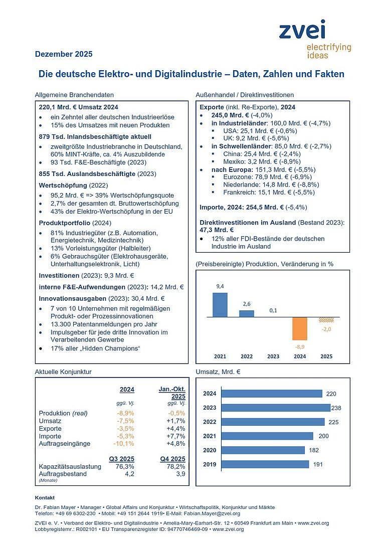 Das Faktenblatt bietet eine aktuelle Übersicht über die wichtigsten Konjunktur- und Strukturdaten zur deutschen Elektro- und Digitalindustrie.