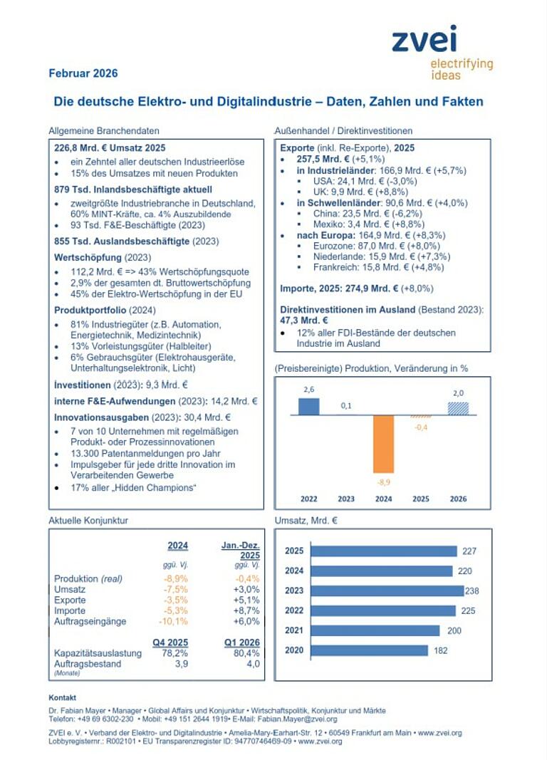 Das Faktenblatt bietet eine aktuelle Übersicht über die wichtigsten Konjunktur- und Strukturdaten zur deutschen Elektro- und Digitalindustrie.