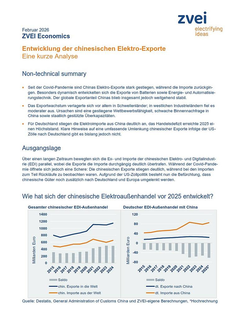 Seit der Covid-Pandemie sind Chinas Elektro-Exporte stark gestiegen, während die Importe zurückgingen. Das Exportwachstum verlagerte sich vor allem in Schwellenländer; in westlichen Industrieländern fiel es moderater aus. Ursachen sind eine gestiegene Wettbewerbsfähigkeit, schwache Binnennachfrage in China sowie staatlich gestützte Überkapazitäten. Für Deutschland stiegen die Elektroimporte aus China deutlich an, das Handelsdefizit erreichte 2025 einen Höchststand. Klare Hinweise auf eine umfassende Umlenkung chinesischer Exporte infolge der US-Zölle nach Deutschland gibt es bislang jedoch nicht.