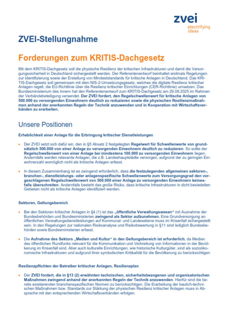 Das KRITIS-Dachgesetz soll gemeinsam mit dem NIS-2-Umsetzungsgesetz, welches die digitale Resilienz kritischer Anlagen regelt, die EU-Richtlinie über die Resilienz kritischer Einrichtungen (CER-Richtlinie) umsetzen. Der ZVEI setzt sich für eine praxisnahe, koordinierte und sektorenübergreifende Umsetzung der beiden Gesetze ein.