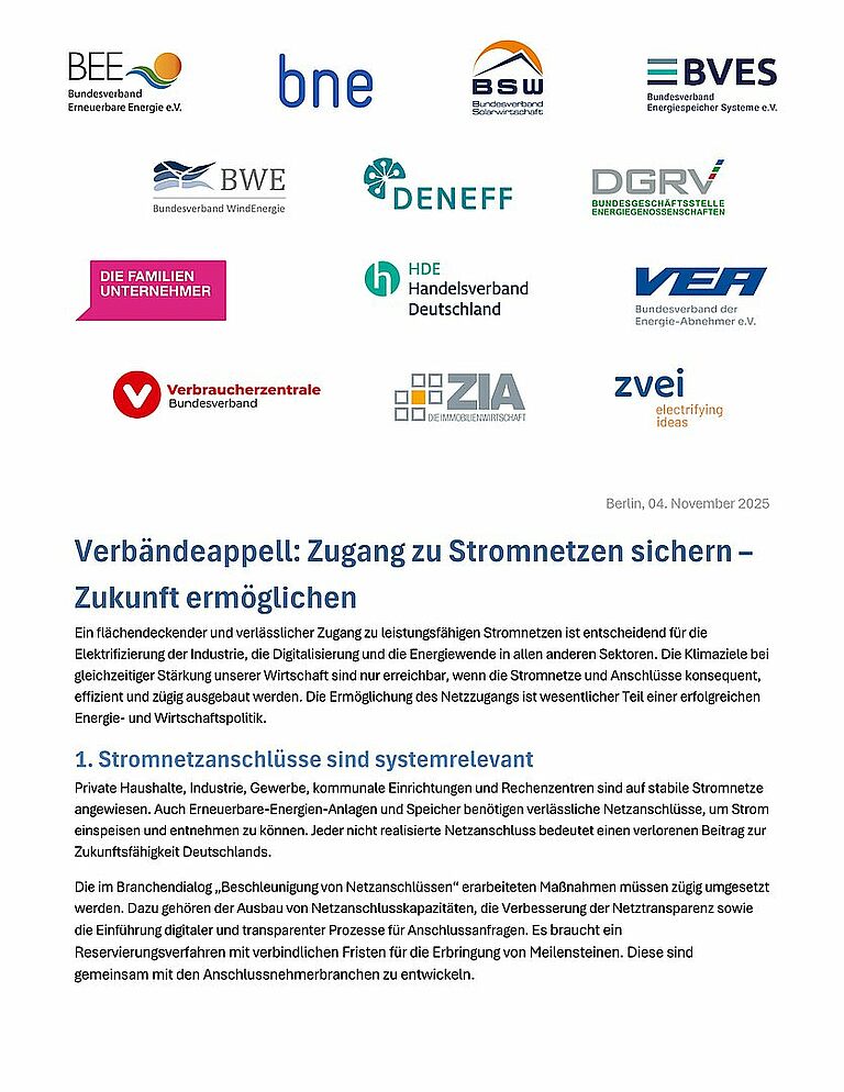 Ein flächendeckender und verlässlicher Zugang zu leistungsfähigen Stromnetzen ist entscheidend für die Elektrifizierung der Industrie, die Digitalisierung und die Energiewende in allen anderen Sektoren. Die Klimaziele bei gleichzeitiger Stärkung unserer Wirtschaft sind nur erreichbar, wenn die Stromnetze und Anschlüsse konsequent, effizient und zügig ausgebaut werden. Ein diverses Bündnis aus Verbänden appelliert an Politik und Netzbetreiber, den Zugang zu leistungsfähigen Stromnetzen deutlich zu verbessern. 13 Verbände fordern gemeinsam den schnellen und effizienten Ausbau von Netzanschlüssen, um die Elektrifizierung der Industrie, die Digitalisierung und die Energiewende in allen Sektoren voranzutreiben. Die Ermöglichung des Netzzugangs ist wesentlicher Teil einer erfolgreichen Energie- und Wirtschaftspolitik.