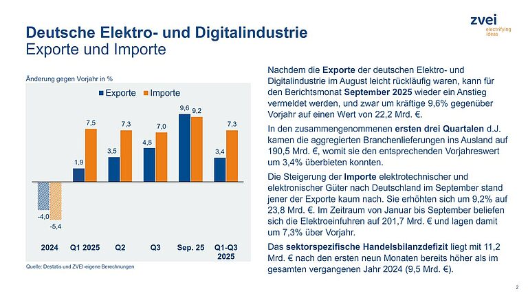 Nachdem die Exporte der deutschen Elektro- und Digitalindustrie im August leicht rückläufig waren, kann für den Berichtsmonat September 2025 wieder ein Anstieg vermeldet werden, und zwar um kräftige 9,6% gegenüber Vorjahr auf einen Wert von 22,2 Mrd. €. Im Geschäft mit China gab es im September den ersten Anstieg seit einem Jahr.