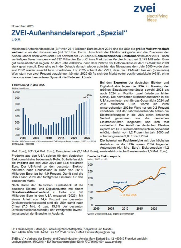 Der US-amerikanische Elektromarkt ist der zweitgrößte der Welt und wird als Ziel deutscher Elektroexporte in seiner Bedeutung nur vom chinesischen Markt übertroffen. Seit der Jahrtausendwende sind die Ausfuhren in die USA stark gewachsen und auch der Anteil deutscher Elektrogüter am US-Markt konnte gesteigert werden. Nach Schwierigkeiten in den 2000er und 2010er Jahren verzeichnete der US-Markt zuletzt starke Zuwächse. Allen Unsicherheiten zum Trotz liegen die USA bei der Wachstumsprognose für 2025 bis zuletzt noch in der Spitzengruppe der entwickelten Länder.