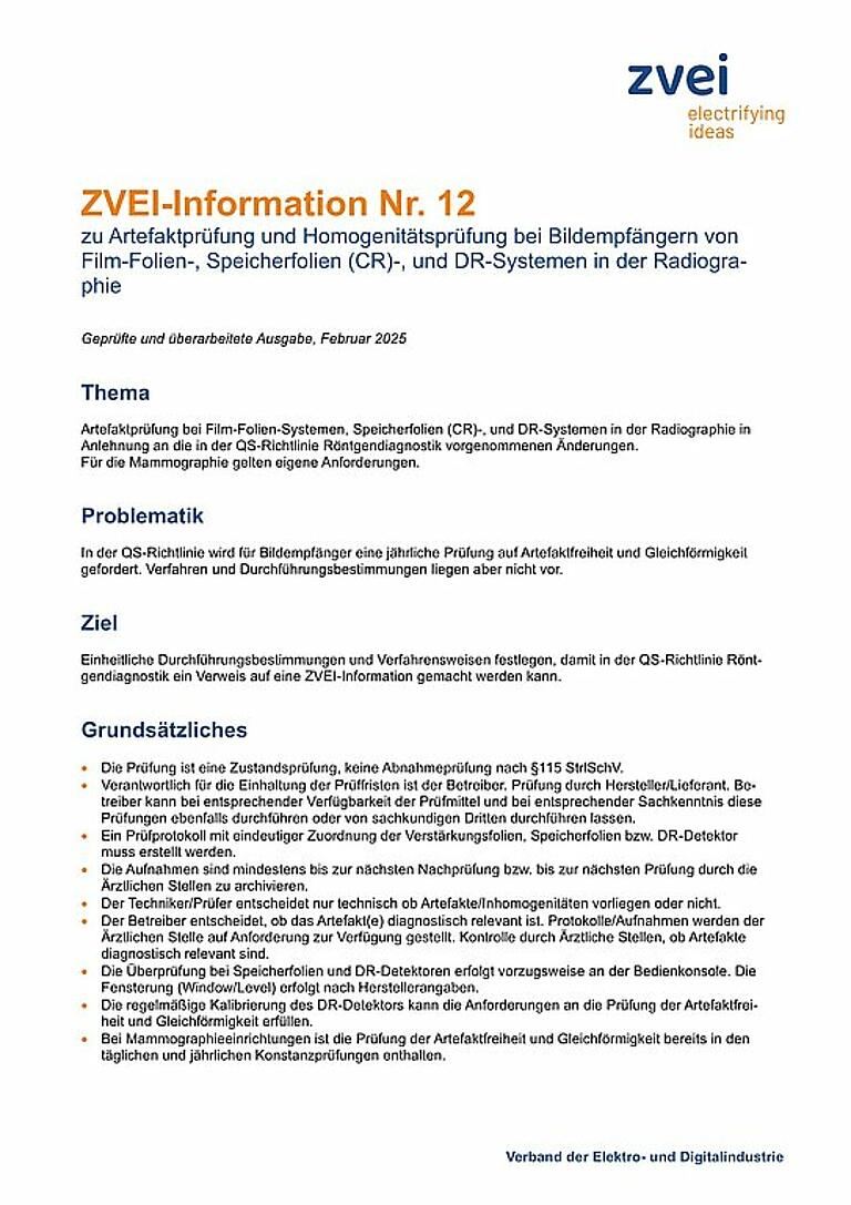 Die ZVEI-Information Nr. 12 enthält eine Hilfestellung zur Artefaktprüfung und Homogenitätsprüfung bei Bildempfängern von Film-Folien-, Speicherfolien (CR)-, und DR-Systemen in der Radiographie. Diese Version ist im Februar 2025 aktualisiert und an die aktuelle QS-Richtlinie Röntgendiagnostik angepasst worden.