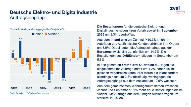 Die Bestellungen für die deutsche Elektro- und Digitalindustrie haben ihren Vorjahreswert im September 2025 um 9,3% übertroffen. Aus dem Inland ging ein Zehntel (+10,3%) mehr an Aufträgen ein. Ausländische Kunden erhöhten ihre Orders um 8,6%. Dabei legten die Auftragseingänge aus der Eurozone zweistellig zu, nämlich um 14,7%. Die Bestellungen aus Drittländern stiegen im September um 5,8%.