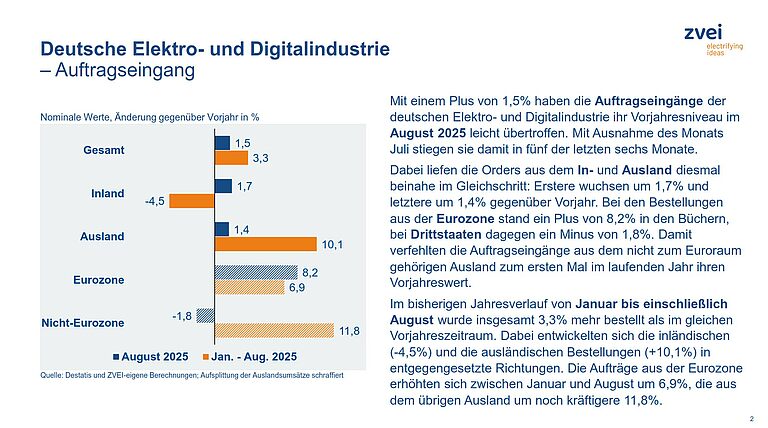 Mit einem Plus von 1,5% haben die Auftragseingänge der deutschen Elektro- und Digitalindustrie ihr Vorjahresniveau im August 2025 leicht übertroffen. Mit Ausnahme des Monats Juli stiegen sie damit in fünf der letzten sechs Monate. Dabei liefen die Orders aus dem In- und Ausland diesmal beinahe im Gleichschritt.
