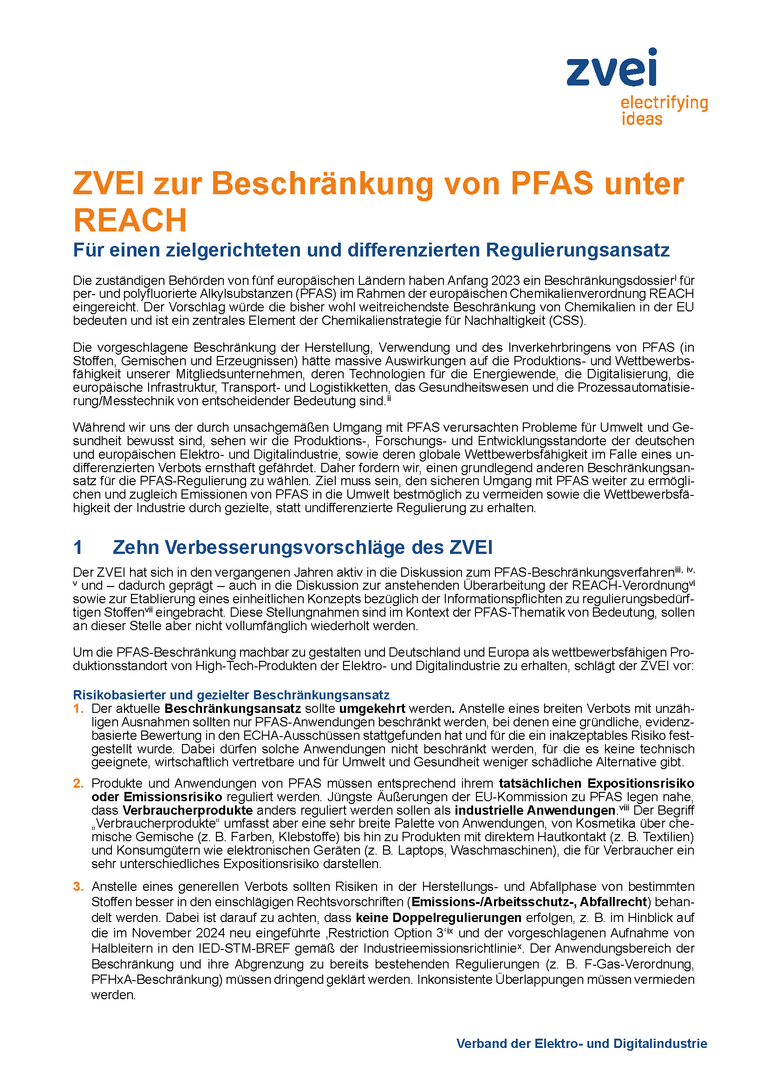 Die Position des ZVEI zeigt mit zehn Kernforderungen, warum nur ein differenzierter, wissenschaftlich fundierter und industriefähiger Regulierungsansatz Umwelt- und Gesundheitsschutz stärken kann, ohne die technologische Basis Europas zu gefährden. Die konkreten Forderungen im Detail finden Sie hier zum Download.