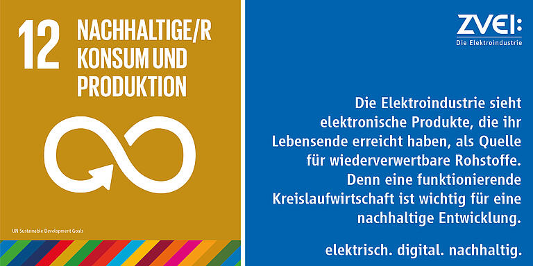 Für die Elektroindustrie ist SDG 12 von hoher Bedeutung: Mit ihren Produkten kann sie sowohl bei der Herstellung als auch im Rahmen der Nutzungsphase einen aktiven Beitrag zur Erreichung des UN-Ziels leisten. Elektronische Produkte, die ihr Lebensende erreicht haben, verstehen wir nicht als Abfall, sondern als Quelle für wiederverwertbare Rohstoffe. Daher steht das Thema Circular Economy aus unserer Sicht auch zurecht ganz oben auf der politischen Agenda.