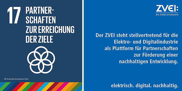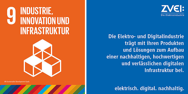 Für die Elektro- und Digitalindustrie ist SDG 9 eines der prioritären SDGs. Zum Aufbau widerstandsfähiger Infrastrukturen und Förderung einer nachhaltigen Industrialisierung und Innovationen leistet die Branche einen entscheidenden Beitrag. Zudem bestehen aus ZVEI-Sicht enge Verbindungen zu weiteren SDGs, insbesondere zu den Zielen Klimaschutz (13), Nachhaltige Produktion (12) und Nachhaltiges Wirtschaftswachstum (8).