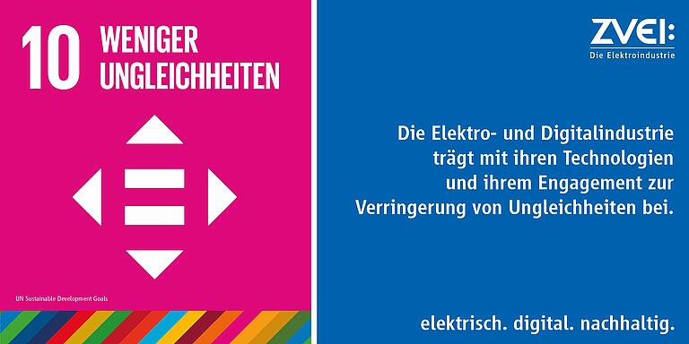 Die Elektro- und Digitalindustrie bietet mit ihrem breiten Produktspektrum in Wachstumsregionen und sich entwickelnden Ländern wichtige Lösungen für zentrale Wirtschafts- und Lebensbereiche: Dazu zählen z. B. eine sichere und energieeffiziente Stromversorgung, moderne Medizintechnik, intelligente und klimaschonende Automatisierungstechnik sowie stabile Kommunikationsnetze. Mit ihren Technologien trägt die Branche indirekt zu SDG 10 bei, globale Ungleichheiten zu verringern.