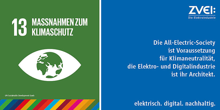 Aufgrund langjähriger Erfahrungen mit der Umsetzung von nachhaltigkeitsbezogenen Anforderungen steht die Elektroindustrie bereit, Lösungen konstruktiv und zielführend mitzugestalten. Dabei sollte auf eine Balance zwischen Wettbewerbsfähigkeit, Umwelt- und Klimaschutz sowie gesellschaftlicher Verantwortung geachtet werden. Nur dann ist die anstehende Transformation tatsächlich nachhaltig. Entsprechend eng ist aus Perspektive der Elektroindustrie die Verknüpfung mit den SDGs 13 (Klimaschutz) und 8 (Nachhaltiges Wirtschaftswachstum).