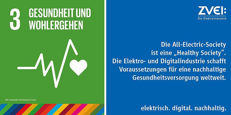 Der Zugang zu hochwertigen Gesundheitsdiensten für alle Lebensphasen ist ein wichtiges Ziel im SDG 3. Denn Nachhaltigkeit bedeutet auch Zugang zu moderner Gesundheitsversorgung mit innovativer Technik für alle und überall. Mit moderner Gesundheitstechnologie kann medizinisches Expertenwissen auch über weite Flächen und für alle Patienten zur Verfügung gestellt werden, wenn eine vernetzte Gesundheitsinfrastruktur zur Verfügung steht. Die Elektro- und Digitalindustrie ist hierbei ein wichtiger Partner.