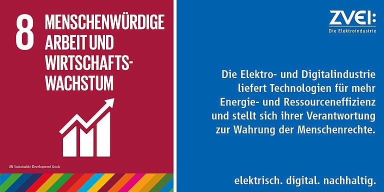 Zum SDG 8 hat die Elektro- und Digitalindustrie daher diverse Anknüpfungspunkte, insbesondere in den Bereichen Wirtschaftswachstum, Wertschöpfung und Arbeitsplätze aber auch Ressourceneffizienz oder Maßnahmen gegen Zwangsarbeit und moderne Sklaverei.
