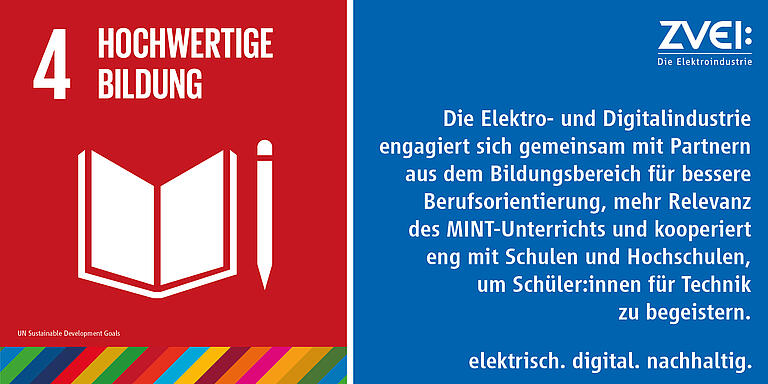 Eine hochwertige Bildung ist ein zentraler Baustein für eine nachhaltige Entwicklung. Denn nur, wenn wir über ausreichendes Wissen und Bewusstsein verfügen, können wir die Transformation hin zu einer All-Electric-Society tatsächlich nachhaltig gestalten. Die Elektro- und Digitalindustrie kann SDG 4 insbesondere über Aus- und Weiterbildungsangebote sowie duale Studienangebote unterstützen – und das in einem hochrelevanten Bereich: Drei von fünf Mitarbeiterinnen und Mitarbeiter der deutschen Elektrofirmen sind MINT-Beschäftigte (Mathematik, Naturwissenschaften, Informatik, Technik). MINT-Fachkräfte werden dringend benötigt, um die Anforderungen von Klimaschutz, Elektrifizierung, Digitalisierung und Automatisierung in der Praxis umsetzen zu können.
