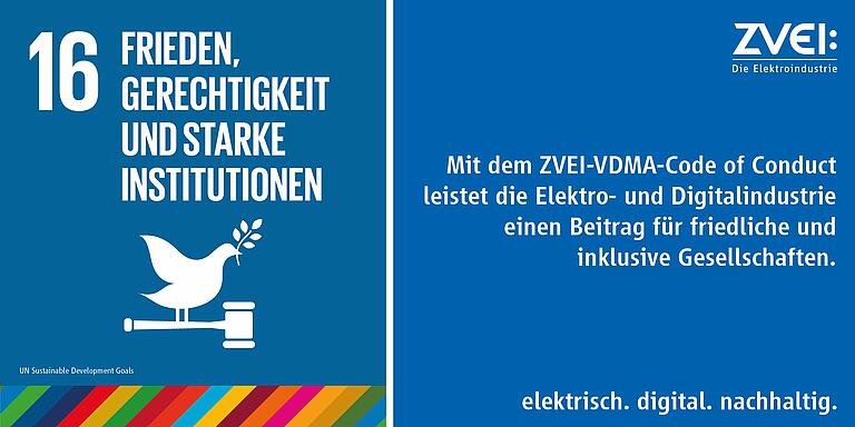 Der ZVEI-VDMA-Code of Conduct (CoC) ist ein Bekenntnis zur Wahrnehmung gesellschaftlicher Verantwortung. Er beschreibt die für die Elektro- und Digitalindustrie sowie den Maschinen- und Anlagenbau relevanten Verhaltensgrundsätze und -standards. Unterzeichnende Unternehmen verpflichten sich im Sinne eines verantwortungsvollen Handelns diese zu beachten. Der CoC greift zahlreiche Inhalte der SDGs auf. Wichtiger Bestandteil sind etwa die Ziele des SDG 16. Unter anderem wird aufgegriffen: