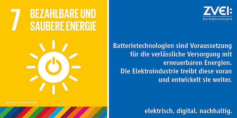 Die Elektroindustrie spielt als Zulieferer und Hersteller von elektrischen Energiespeichern eine entscheidende Rolle. Insbesondere bei Blei-Säure-Batterien und Lithium-Ionen-Batterien, wobei letztere immer wichtiger werden. Ob dezentral in Privathäusern mit Photovoltaikanlagen, in öffentlichen Einrichtungen als Notstromspeicher oder auch direkt verbunden mit gewerblichen Photovoltaik- oder Windkraftanlagen – Batteriespeicher werden in diversen Konstellationen benötigt. Damit leisten sie einen elementaren Beitrag zur nachhaltigen Entwicklung, insbesondere zum UN-Nachhaltigkeitsziel Nummer sieben.