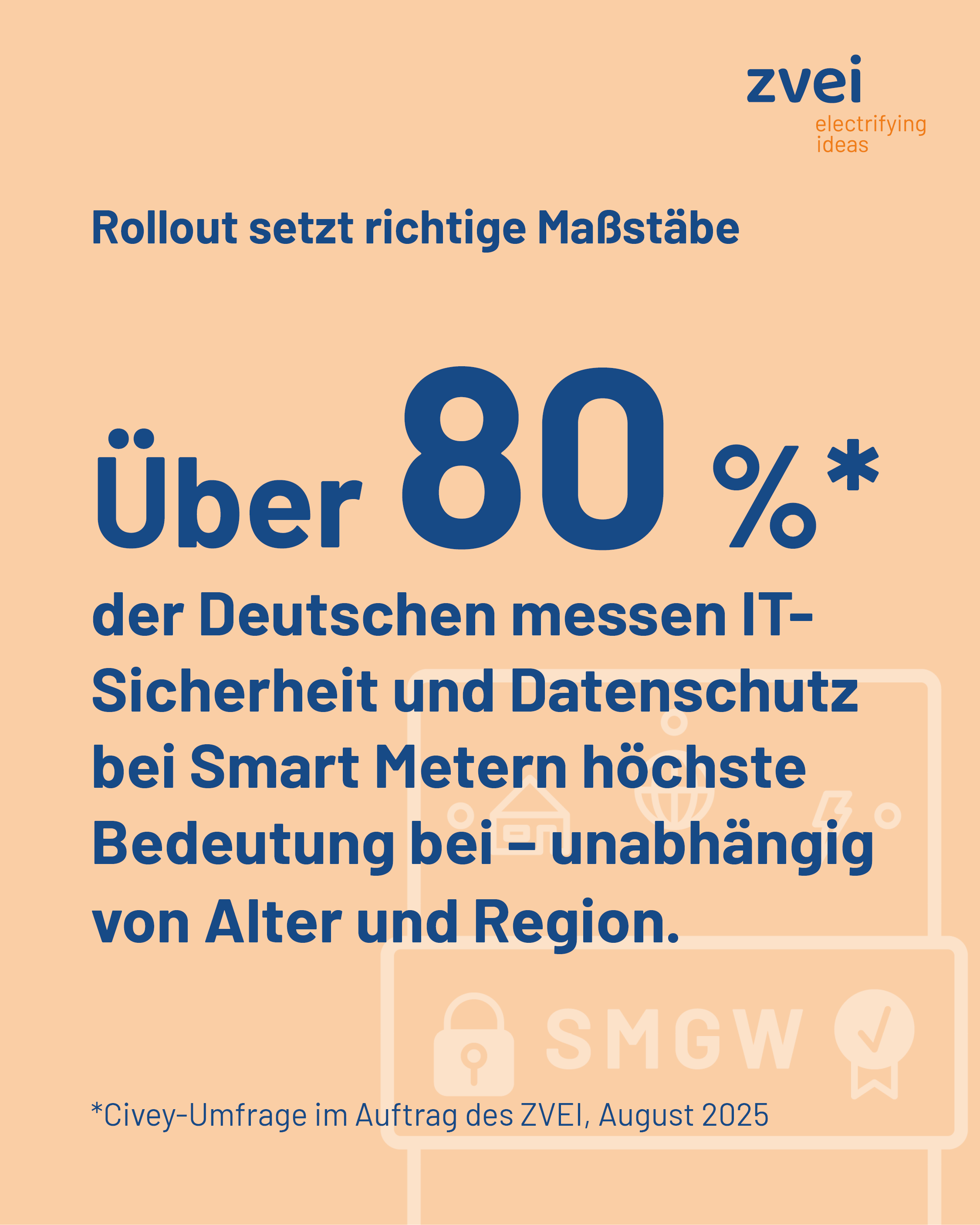 Cybersicherheit ist dabei keine Zusatzanforderung, sondern Voraussetzung für Vertrauen und Akzeptanz. Laut einer aktuellen Civey-Umfrage im Auftrag des ZVEI halten 82 Prozent der Menschen in Deutschland Datenschutz und IT-Sicherheit bei Smart Metern für besonders wichtig.