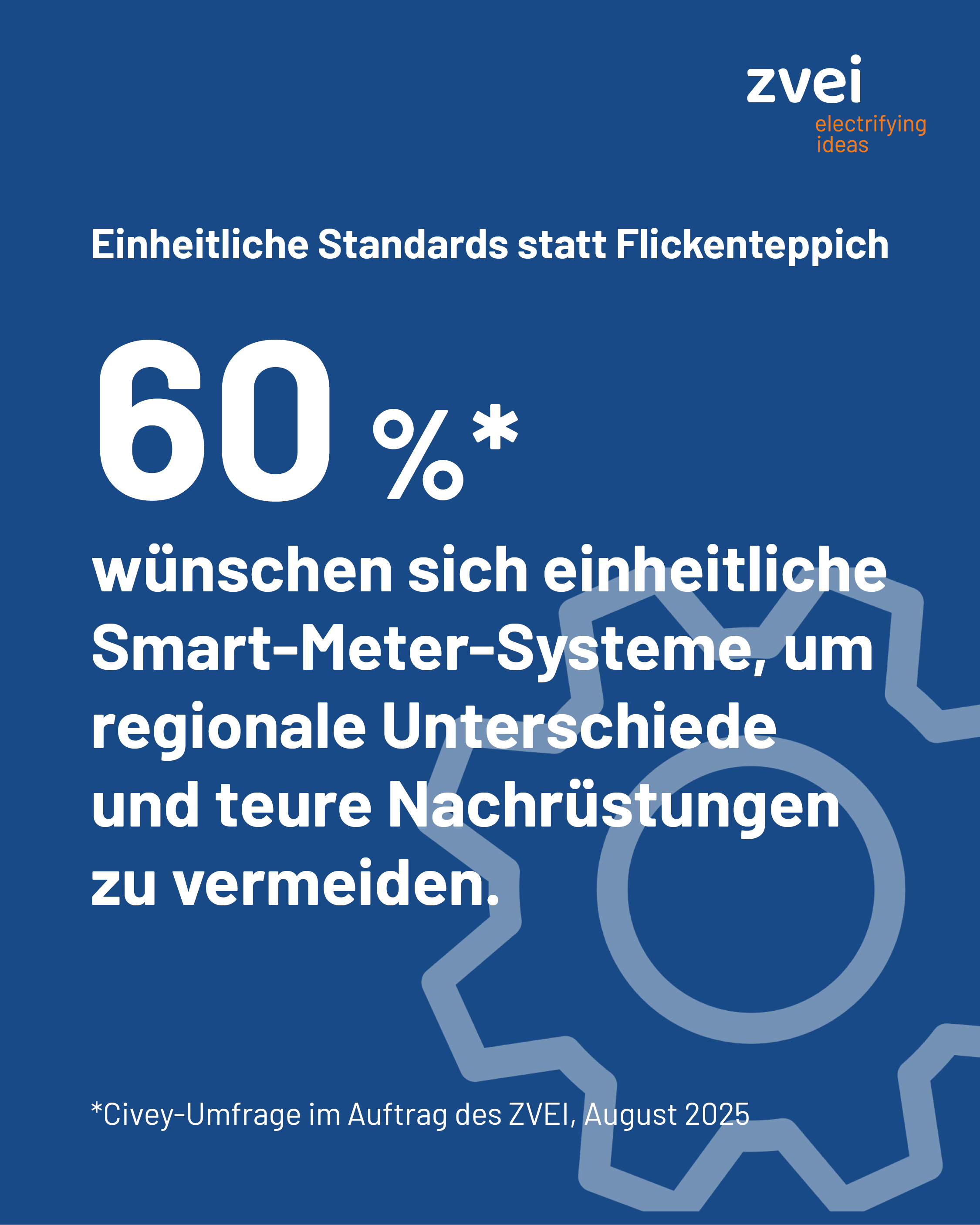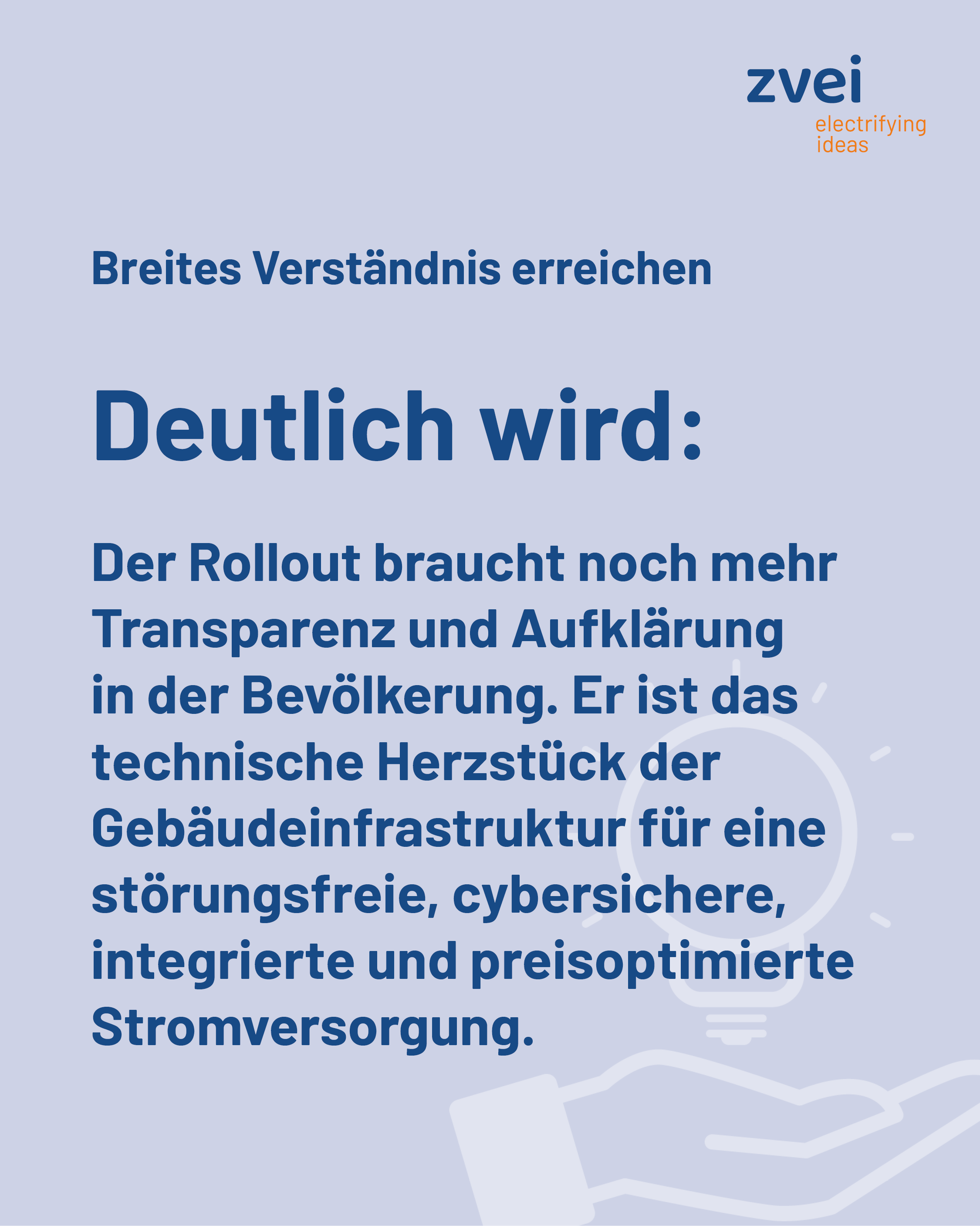 Damit der beschlossene Steuerungsrollout die erwarteten Effekte erzielen kann, ist der landesweite Rollout von iMsys mit einheitlichen Funktionalitäten sehr wichtig. 60 Prozent der Befragten befürworten laut ZVEI-Umfrage diesen Weg, um teure Nachrüstungen und regionale Unterschiede zu vermeiden. Alternative und vermeintlich einfachere Lösungen („Smart Meter light“) würden lediglich Doppelstrukturen schaffen und Ressourcen binden – ohne zusätzlichen Nutzen.