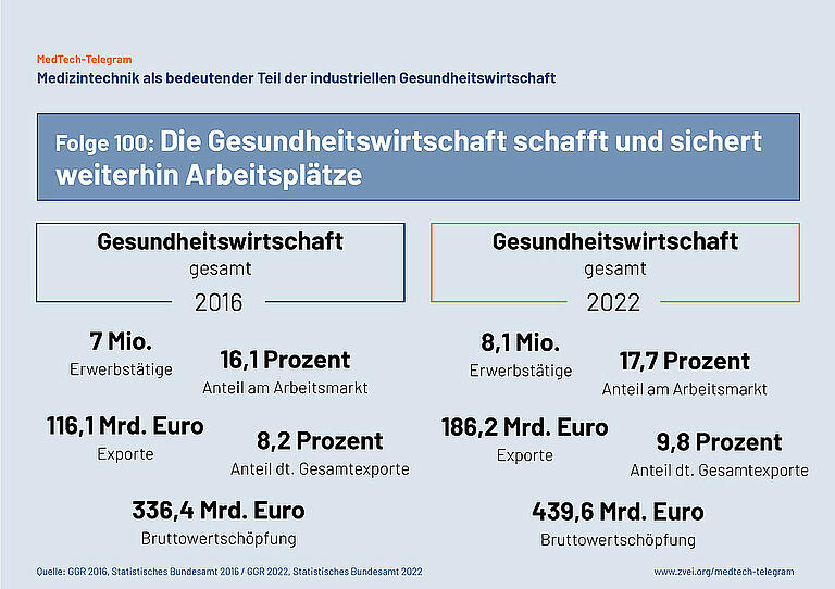 Seit 2016 ist die deutsche Gesundheitswirtschaft stetig gewachsen. Die Beschäftigung ist von 7 Millionen in 2016 auf 8,1 Millionen in 2022 gestiegen. Dabei ist der Anteil der Beschäftigten der deutschen Gesundheitswirtschaft an der Gesamtbeschäftigung um 1,6 Prozentpunkte auf 17,7 Prozent gestiegen. Auch die Exporte legten deutlich zu und die Branche hat ihren Anteil an den deutschen Gesamtexporten um 1,7 Prozentpunkte ausgebaut. 2022 exportierte die deutsche Gesundheitswirtschaft 70,1 Milliarden Euro mehr als noch 2016. Auch die Gesamtbruttowertschöpfung der deutschen Gesundheitswirtschaft zog kräftig von 336,4 Milliarden auf 439,6 Milliarden Euro an.