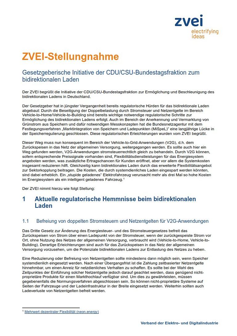 ZVEI-Stellungnahme: Gesetzesinitiative zum bidirektionalen Laden