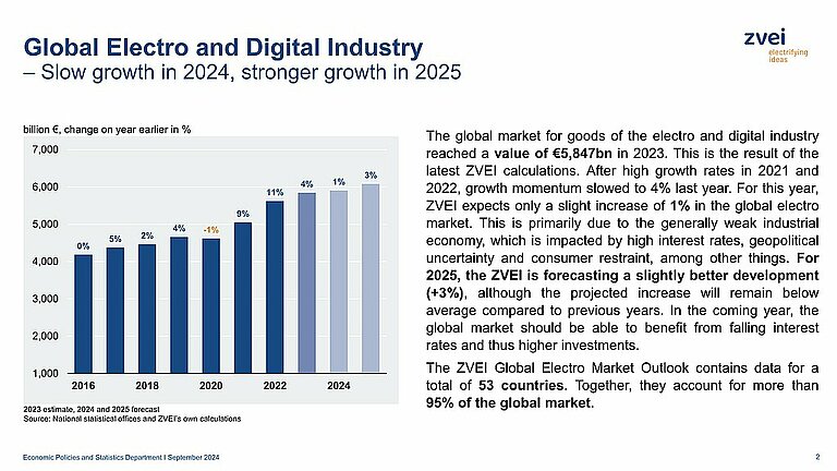 ZVEI's latest Global Market Outlook of Electo and Digital Industry provides forecasts for the current and the next year, containing predictions for the global market but also for more than 50 single country markets. Additionally, the outlook includes forecasts for twelve considered sub-branches.