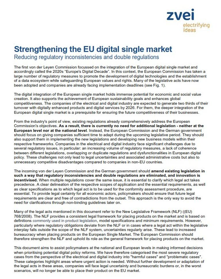 The digital integration of the European single market holds immense potential for economic and social value creation. The companies of the electrical and digital industry are expected to generate two thirds of their turnover with digitally enhanced products and digital services by 2026. For them, the deeper integration of the European digital single market is a prerequisite for ensuring the future competitiveness of their businesses. However, companies across all industry sectors face significant challenges due to several regulatory issues, in particular: an increasing volume of regulatory measures, a lack of coherence between different legislations, overlapping or duplicate regulations and dysfunctionalities in European digital policy. These challenges not only lead to legal uncertainties and associated administrative costs but also to unnecessary competitive disadvantages compared to companies in non-EU countries. This document aims to assist policymakers at the national and European levels in making informed decisions when prioritising potential digital policy reforms. Therefore, the incoming von der Leyen Commission and the German government should amend existing legislation in such a way thatregulatory inconsistencies and double regulations are eliminated, and innovation is incentivised.