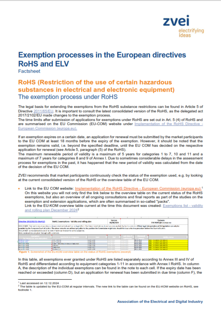 The RoHS Directive restricts the use of certain hazardous substances in electrical and electronic equipment, that can be replaced by safer alternatives. These restricted substances include heavy metals, flame retardants and plasticisers. Under certain conditions, the RoHS Directive allows for temporary exemptions from the substance restrictions, which are based on the current state of science and technology. Economic operators must apply for an extension of the exemption at least 18 months before the expiry date. After evaluating the application, the EU Commission decides whether to extend the exemption or reject the application. The considerable delays of this procedure lead to great uncertainty in the industry and to many enquiries to the ZVEI.