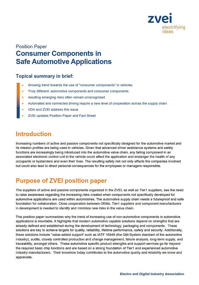 In the ZVEI working group Consumer Components in Safe Automotive Applications (CCSAA), experienced component manufacturers in cooperation with Tier1 published an accompanying fact sheet back in 2015, which has now been updated. This fact sheet identifies possible differences for active and passive components in the areas of semiconductor and housing technology, component development, validation, characterization, qualification, production, testing and support throughout the entire component life cycle. It shows the possible ranges of differences in the individual factors and the potential consequences resulting from them.